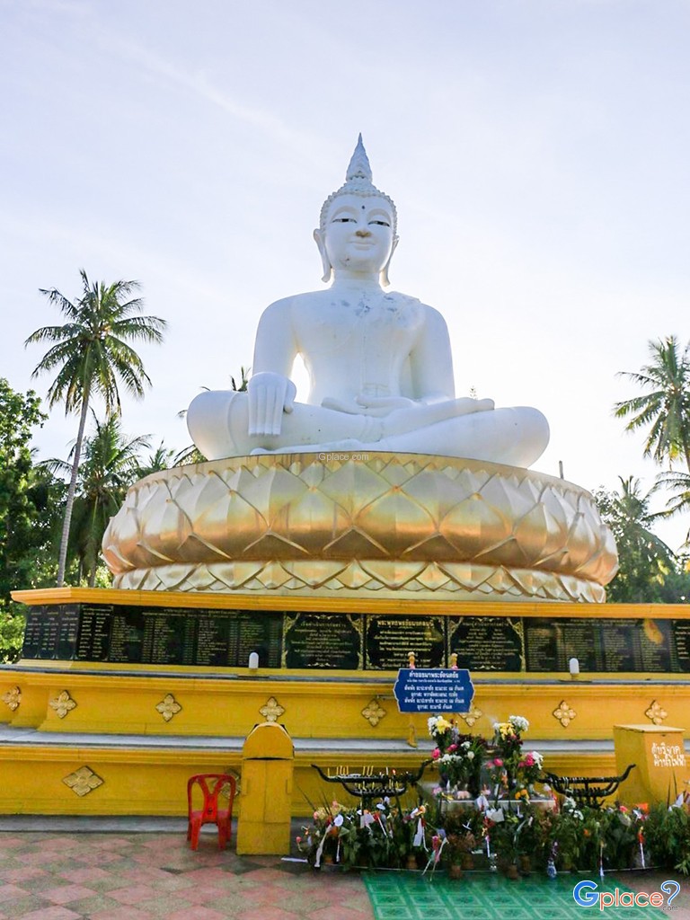 “Wat Laem Son houses Phra Phuttha Phonchai Mongkolmuni, a large white Buddha image in the Maravichai posture that contains sacred relics within.”