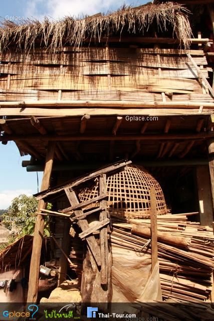 The Hmong live in houses that sit right on the ground, not on stilts as do most on the other tribes. However, the main floor of their houses is not at ground level, but rests upon a kind of above-ground basement or root cellar that they use for food storage. Moreover, their house-fronts slope outward and downward, an architectural feature that is the trademark of their villages.