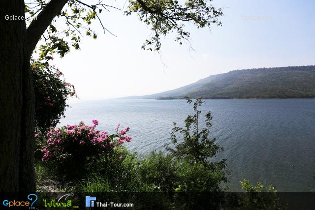 “A large earthen dam on the main road of Mittraphap Road, with a view of a vast reservoir surrounded by mountains, suitable for stopping to rest, take photos, and watch the sunrise/sunset.”