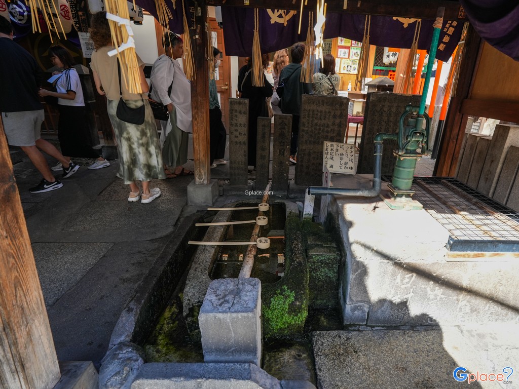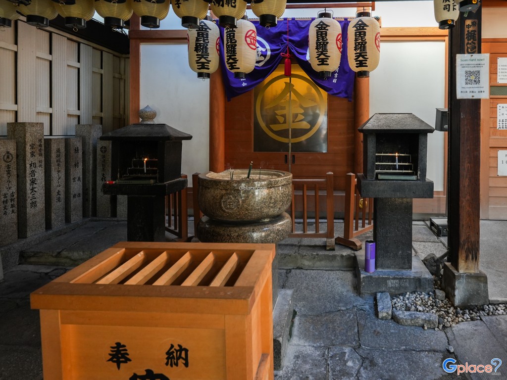 The temple is located within Hozenji Yokocho, a narrow stone-paved alley with traditional restaurants, bars, and long-established sweet shops such as Meoto Zenzai, famous for its zenzai (sweet red bean soup with mochi). The alley is especially atmospheric in the evening when paper lanterns light up, creating a warm, nostalgic ambiance.